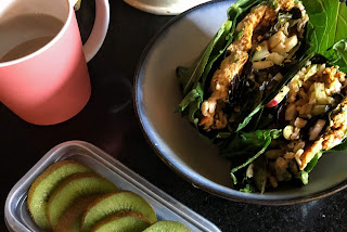 | Collard wraps with tempeh, brown rice, avocado, veggies, sesame oil |