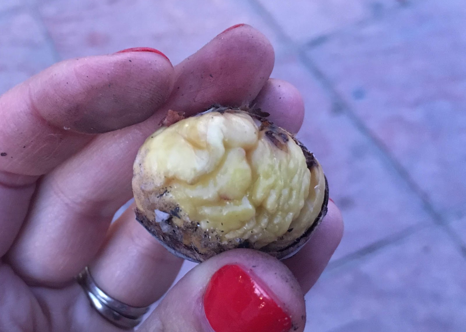 The outside skins are gray and charred. It is satisfying to peel them off in stiff layers. Inside is the meat of the nut. It looks a little like brains. The texture is a tad mealy, like a baked potato, and the taste is creamy salty delicious. I look forward to buying many more cones of chestnuts throughout the winter here. And enjoying many more slipper wearing, treat eating, blanket wrapped movie nights.
