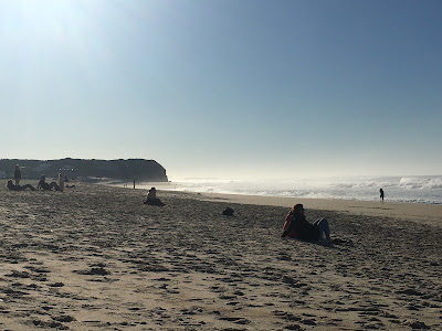 Next, we went to a little town and found a park while we waited for the bus to take us to the beach. This was mainly a stopover town, and we excitedly boarded the bus to set off to our final destination. The heat was turned way up on the bus, and we couldn’t wait to get off. As the bus rounded a bend and the beach came into view, we let out a collective, “Ooooh!” The Atlantic waves crashed against the Portugal shore. A cliff was off to the left, and mist from the waves hung in the distance.
