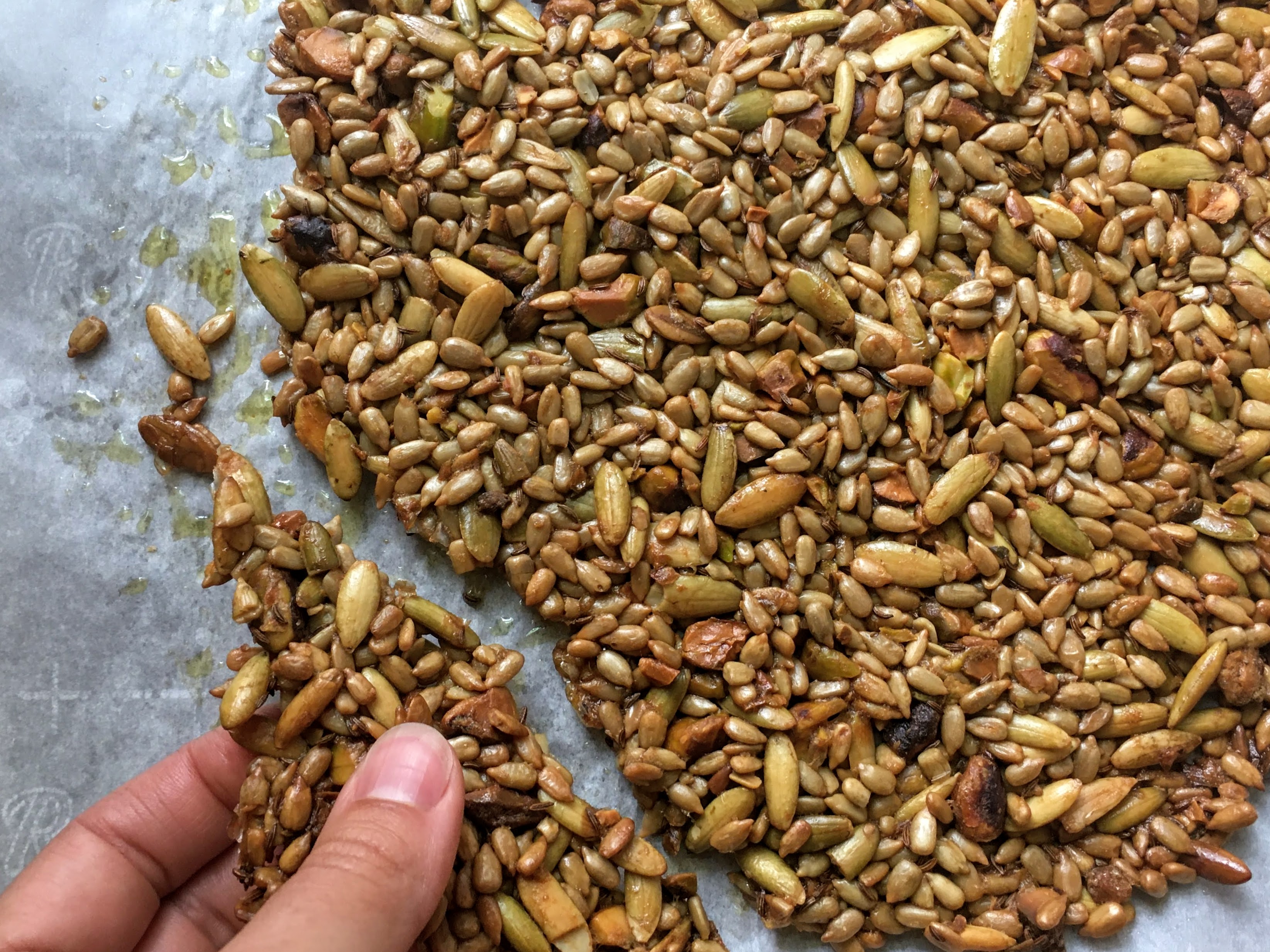 This recipe uses sunflower seeds and pistachios, but you can easily make it nut free by using pumpkin seeds instead of pistachios. You can also add in other nuts, such as almonds or walnuts, as long as they are chopped finely. I have used different combinations for this snack mix and it always turns out well. The key is using the egg white to “glue” the mixture together. That way you get nice cracker-type pieces that break off easily without crumbling.