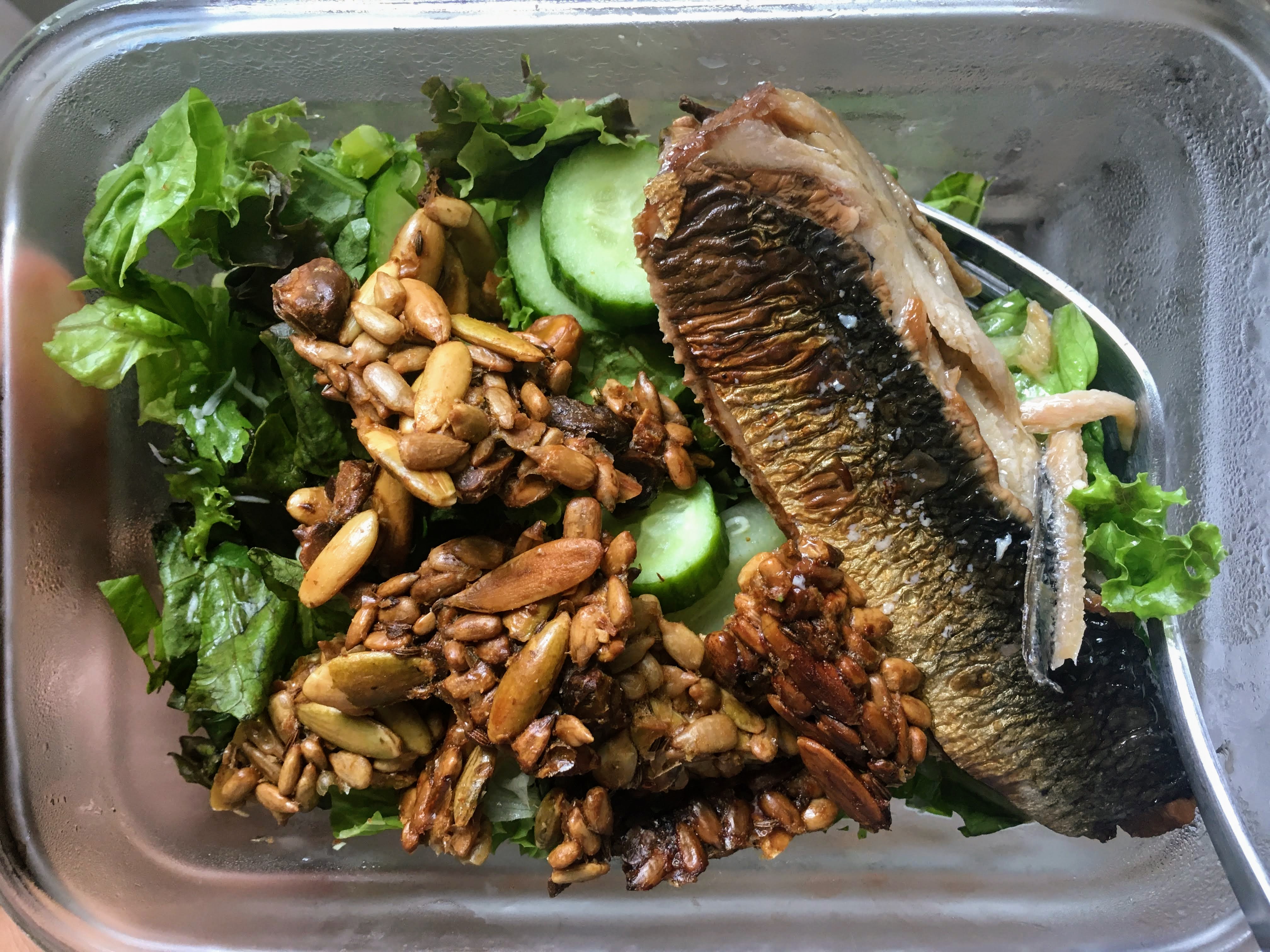 1. Make a nice, green salad, using Romaine or green leaf lettuce, parsley, cilantro, scallions, cucumber and green olives. Splash in some apple cider vinegar. Add smoked herring and crumbled snack mix on top.