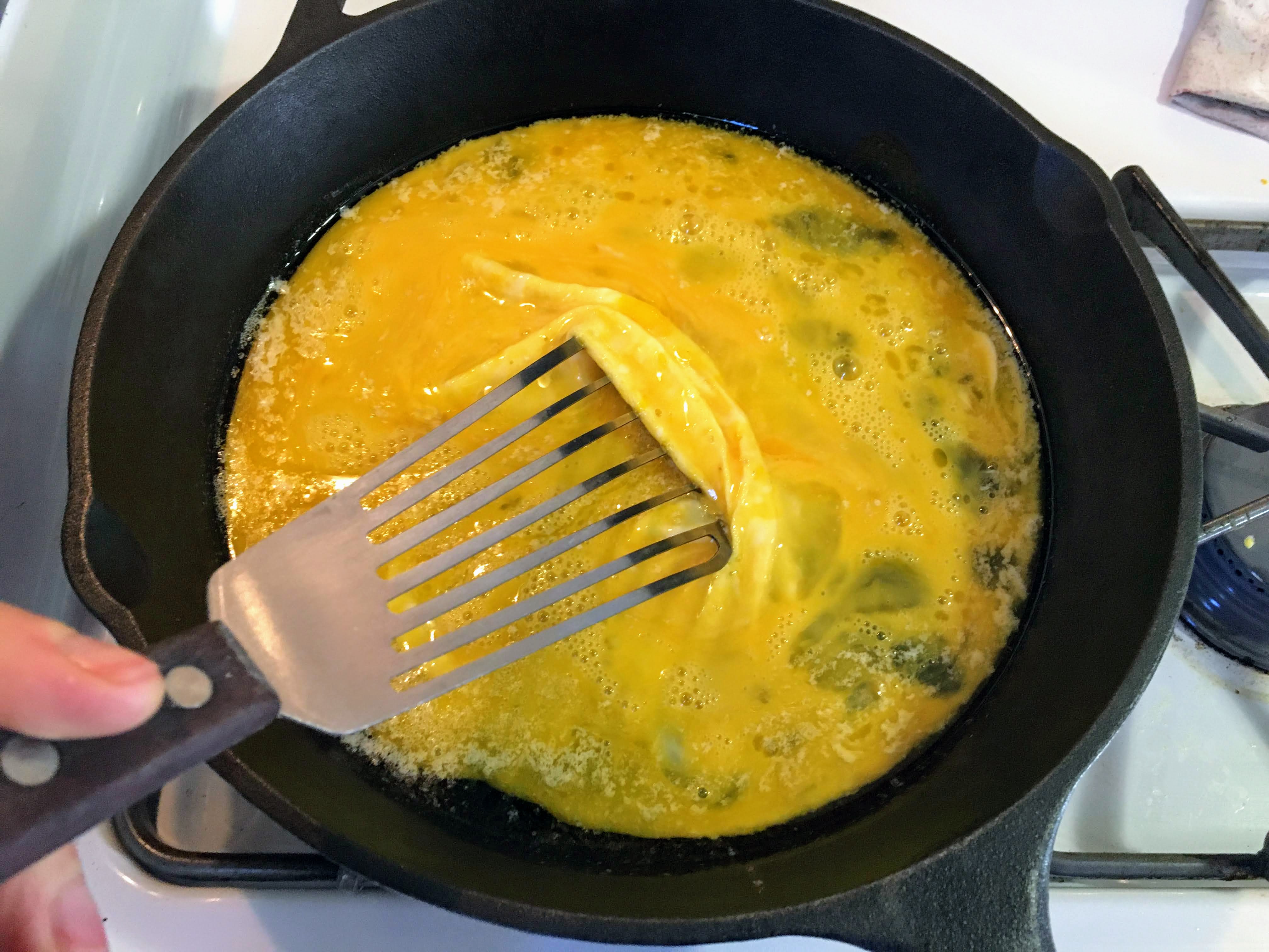 I also learned, and this is key, to turn off the heat before the eggs are finished cooking. The residual heat from the pan finishes cooking the eggs to perfection with just the slightest bit of runniness. If you wait until your eggs look perfect over the heat, they will be overcooked in the seconds it takes you to turn of the heat and move the pan.
