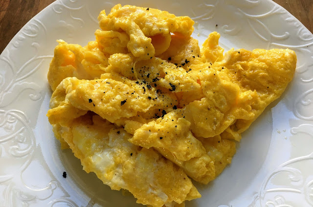 Back to scrambled eggs. I did some research over the years. I learned that the eggs need to cook low and slow to break down the protein in the eggs. This results in creamy scrambled eggs, even without the addition of milk or cream (although milk or cream added to eggs is heavenly). See that photo above? The pan heat should be so low that there is no sizzle when you pour in the eggs. You almost get bored waiting for a thin layer to solidify on the bottom of the pan. Then, you take a spatula and scrape the bottom of the pan in towards the middle. Repeat, repeat, repeat until the eggs are almost done.